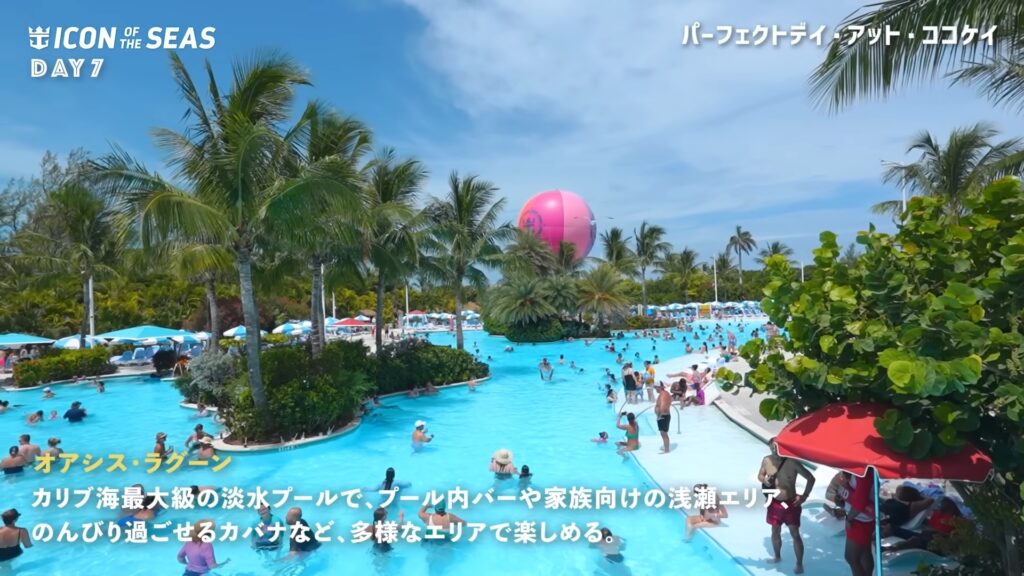ロイヤル・カリビアンには、専用のプライベートアイランドがあり、一つの寄港地になっています。カリブ海最大級のラグーンプール(無料)や綺麗なビーチに加えて、無料の軽食コーナーもあり、手ぶらで一日中楽しめる環境が整っています。