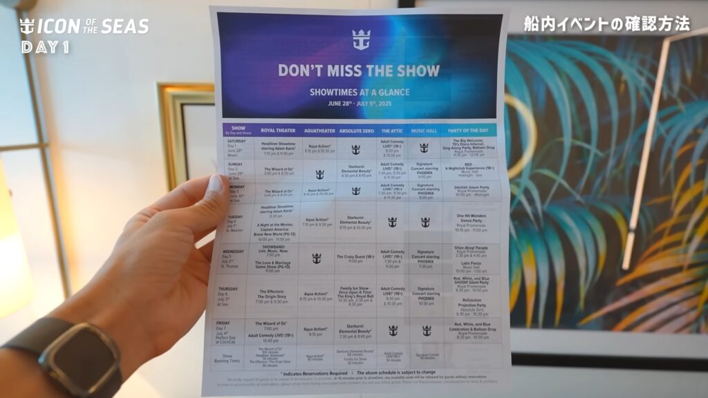 また、イベントはアプリでも確認することができます。乗船前のクレジットカード登録、ショーやアクティビティの予約、毎日のスケジュール確認など、全てアプリで行うことができるためダウンロード必須です。人気のショーやレストランはすぐに満席になるため、早めに予約しましょう。