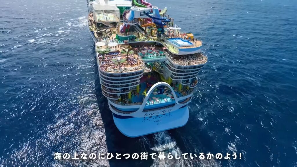 「アイコン・オブ・ザ・シーズ」は2024年に誕生したクルーズ船です。全長365メートル、総トン数250,800総トンの現時点で世界最大のクルーズ船で、乗客と乗組員を合わせると約1万人が乗船可能です。ロイヤル・カリビアン社の8つのクラスの中で、最も大きく豪華な「アイコンクラス」に属します。2025年 夏には「スター・オブ・ザ・シーズ」、翌年には「レジェンド・オブ・ザ・シーズ」がデビュー予定で、合計3隻体制となります。