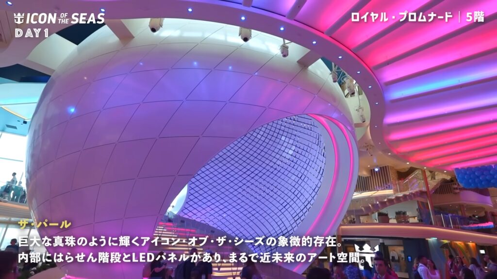 船の中心部に位置するメインストリートです。中央には「ザ・パール」と呼ばれる巨大な球体のオブジェがあり、色鮮やかに光を放っています。通路の周りにはショップやバーが立ち並びます。