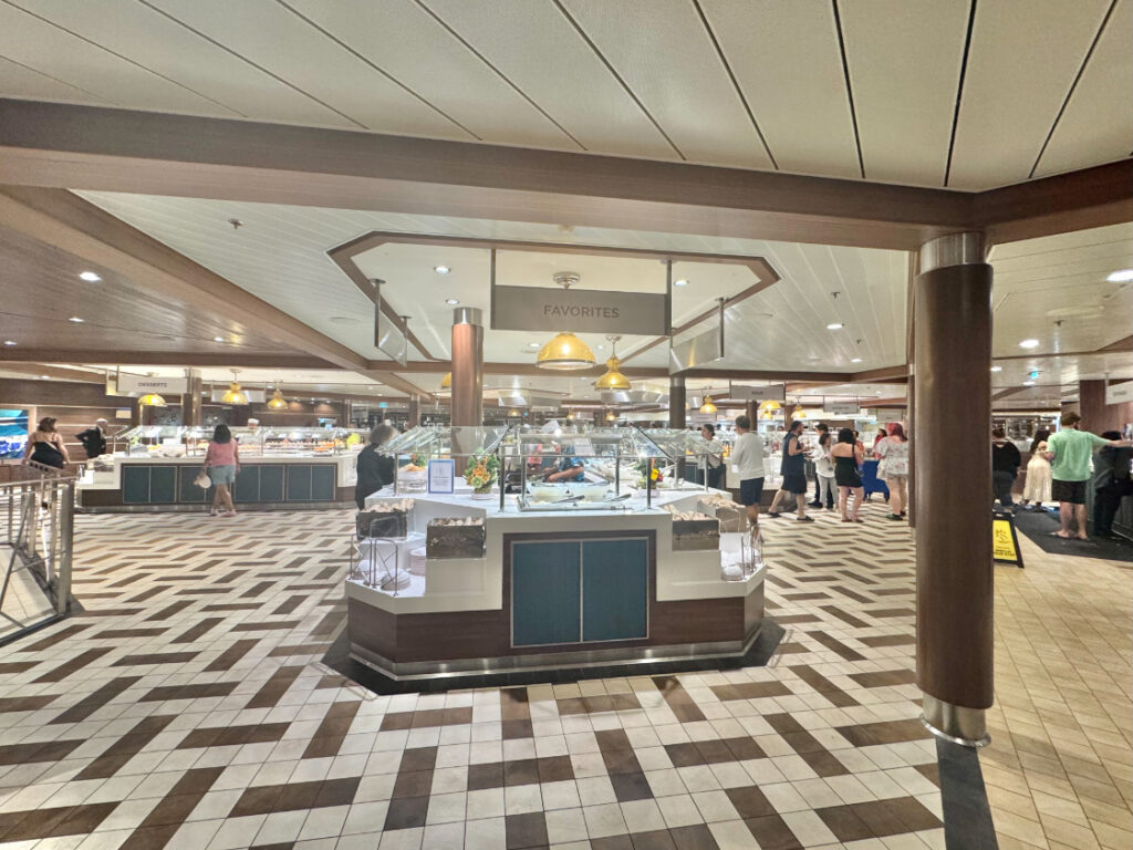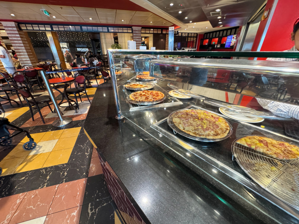 ビュッフェ形式の「ウィンドジャマー・マーケットプレイス」では、ピザ、フライドポテト、カレー、グリル料理など子ども受け抜群のメニューが並びます。