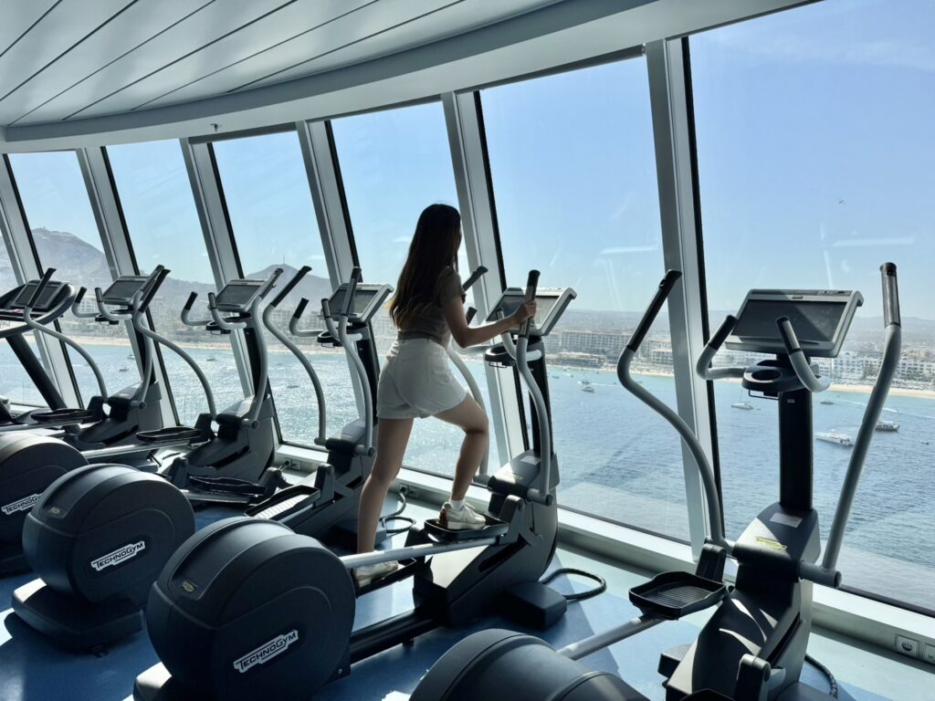 海の上から絶景を眺めながらのトレーニングもクルーズ船ならではの光景です。普段運動が苦手な方でも楽しみながらトレーニングやストレッチができますよ!