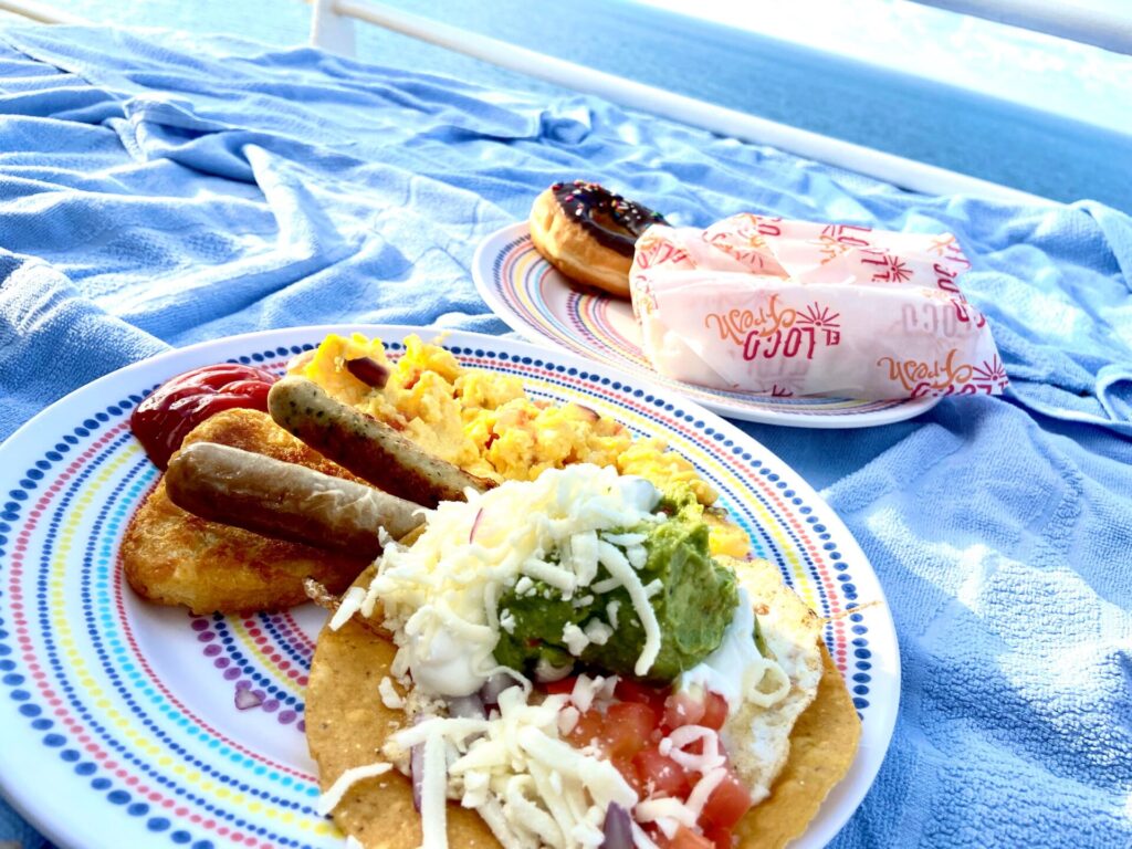 これはメキシカンレストランでピックアップした朝食を屋上デッキのプールサイドで戴いている時の写真。