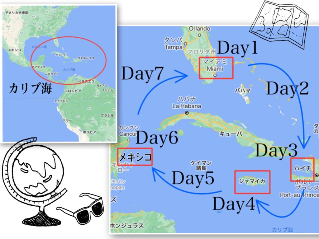 下の画像の通り、アメリカのマイアミを出発してハイチ共和国のラバティ→ジャマイカのファルマス→メキシコのコスメルの3箇所に寄港し、またマイアミに戻ってくる西カリブ海を7泊8日で巡るクルーズ旅行をハネムーンに決定しました。