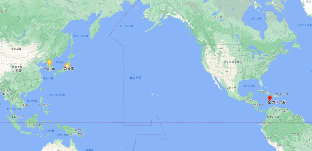 下の画像でご覧頂ける通り、北アメリカ大陸と南アメリカ大陸の間にある海で、日本からとてもとても遠い場所です。