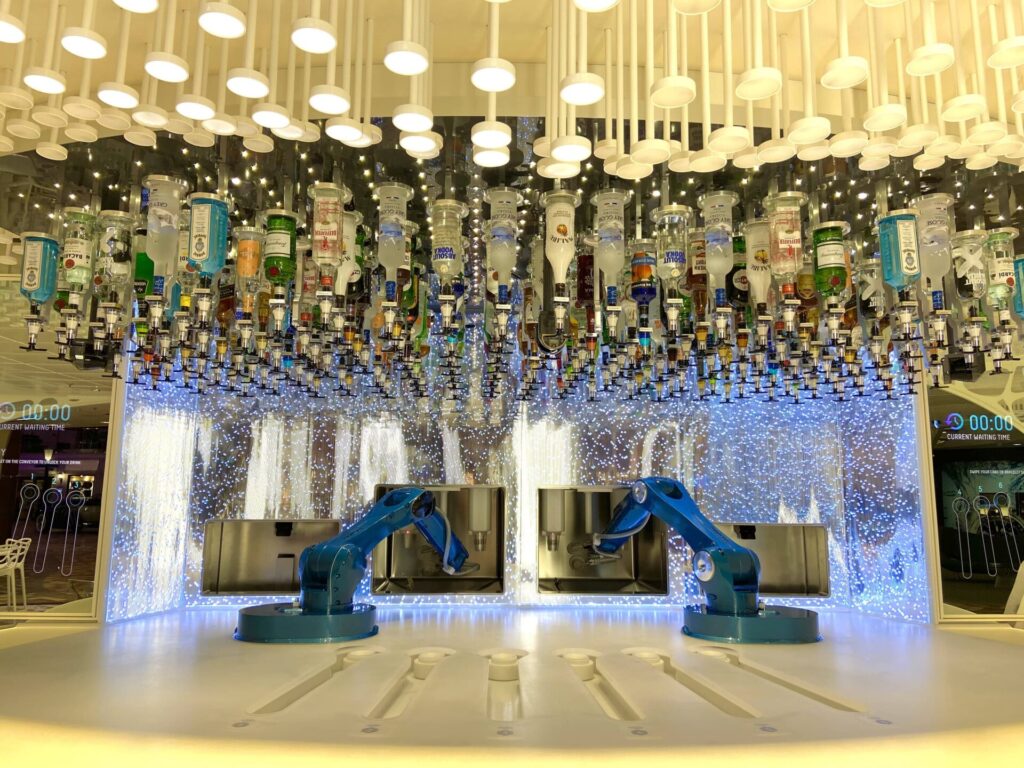タブレットでドリンクを選ぶと、中央に2台あるロボットアームがシェイカーにお酒を注ぎ、軽快なリズムでシェイクしてカクテルを作ってくれるんです。