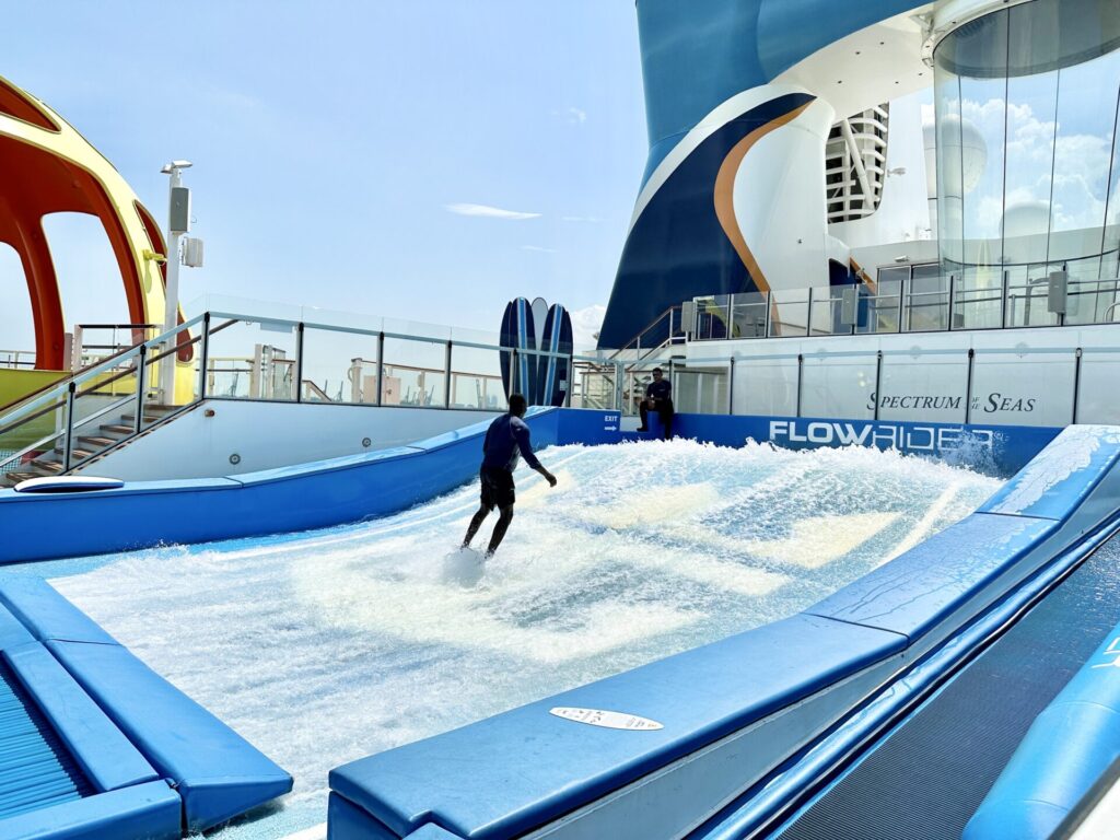 驚くのはまだ早いと、船上のサーフィン設備「フローライダー」にスカイダイビング設備の「iFLY」。