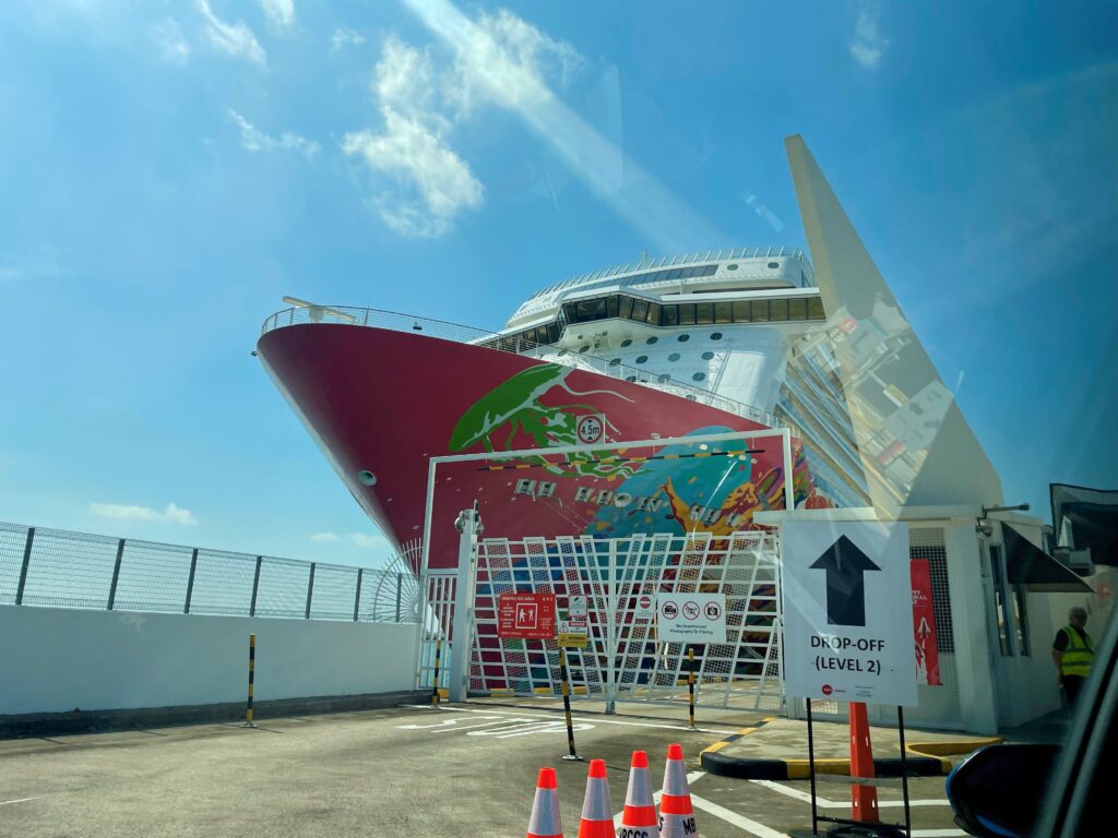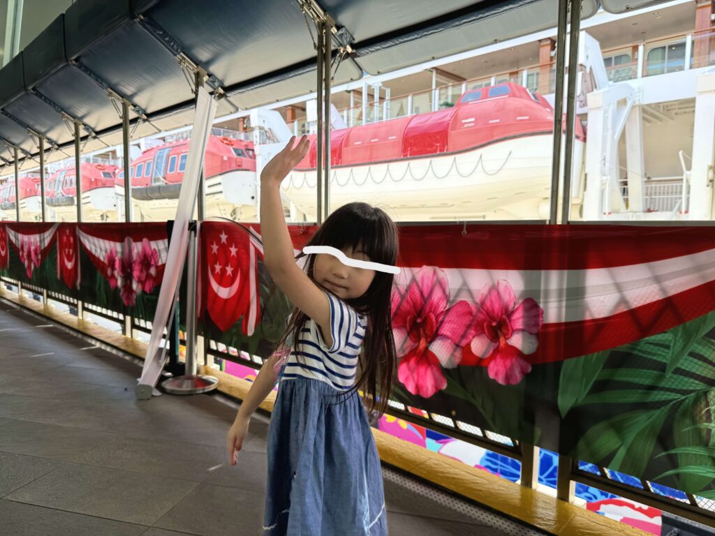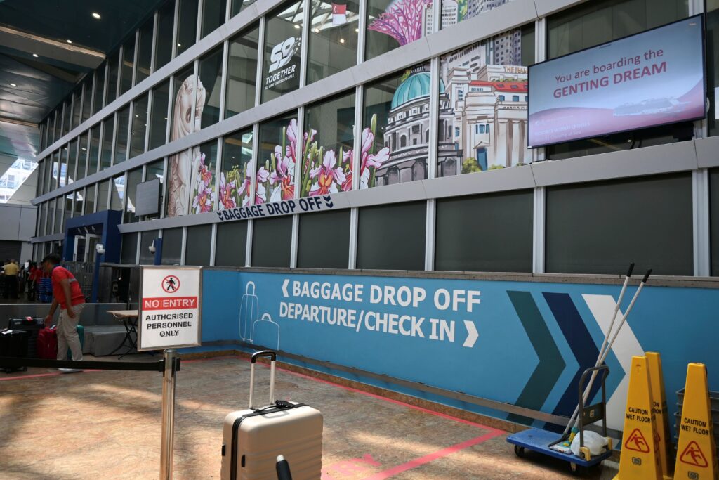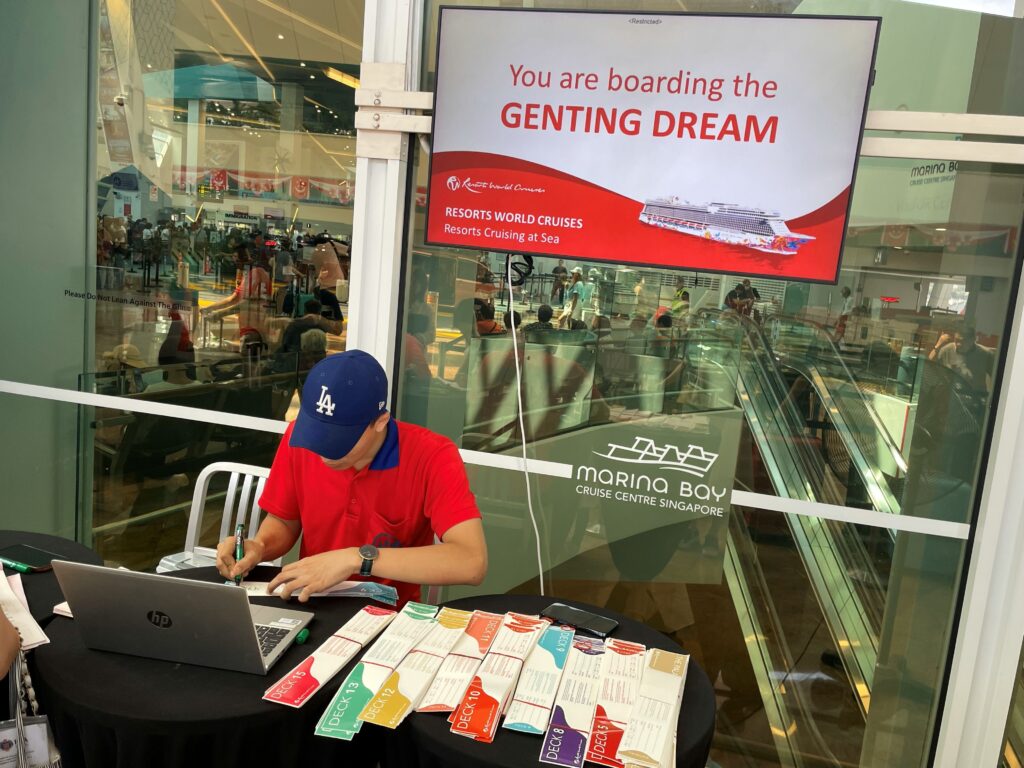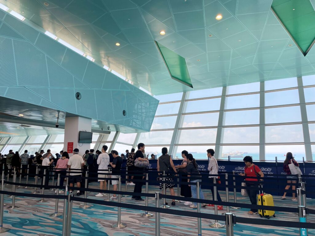 シンガポールのクルーズターミナルには11時すぎに到着。外にはバゲージチェックインの列が2つ。夏の暑さ対策か、巨大扇風機が回っていて助かりました。乗船券を見せると、スタッフさんが手際よくバゲージタグを付けて、スーツケースを運んでくれます。