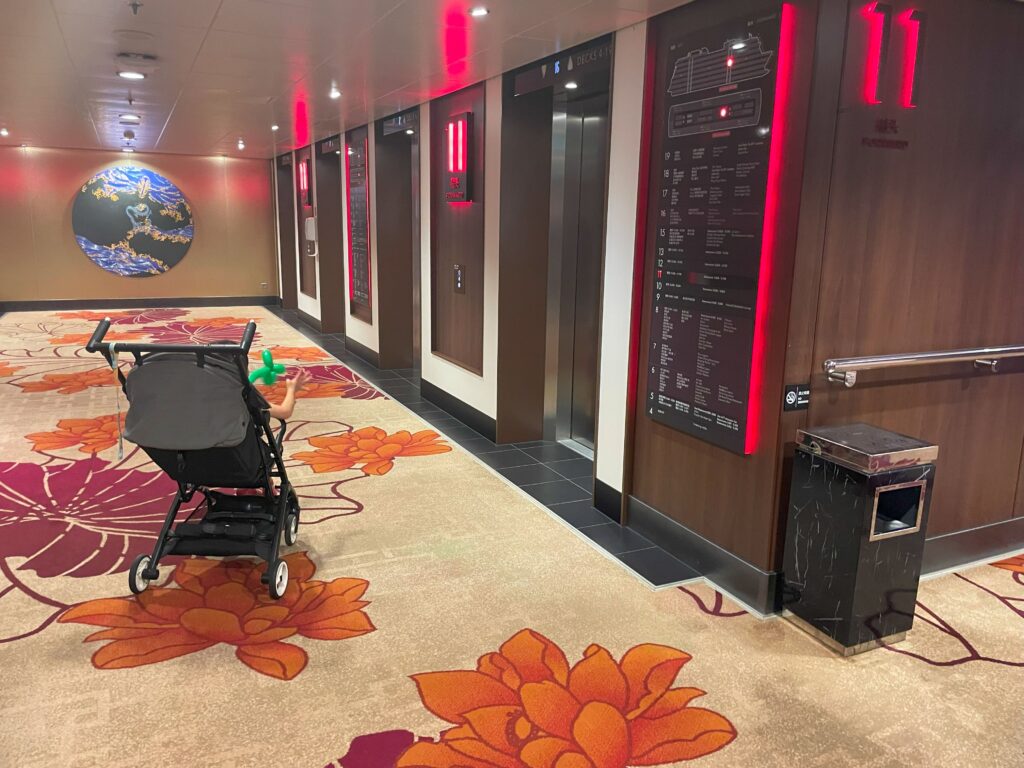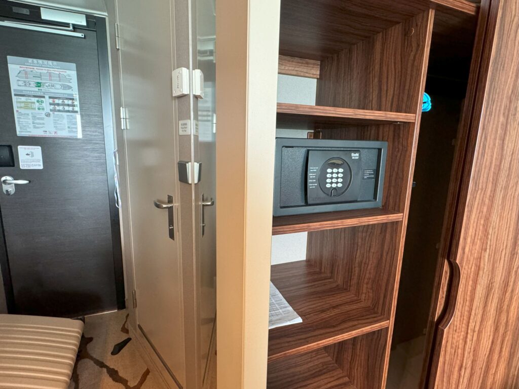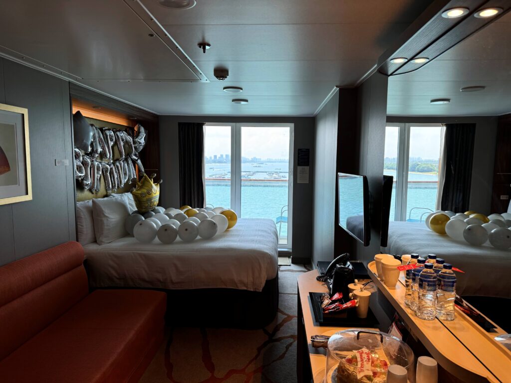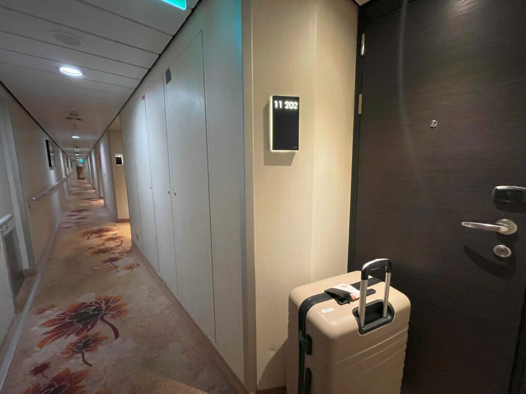 驚きながらも、扉に出したままのスーツケースを取りに行くと、客室係の方が反応をこっそり見守っていた模様。「素敵なクルーズになりますように!」と声を掛けていただき、さらに嬉しく、あぁ……クルーズは記念旅行に最適だなと改めて感じました。