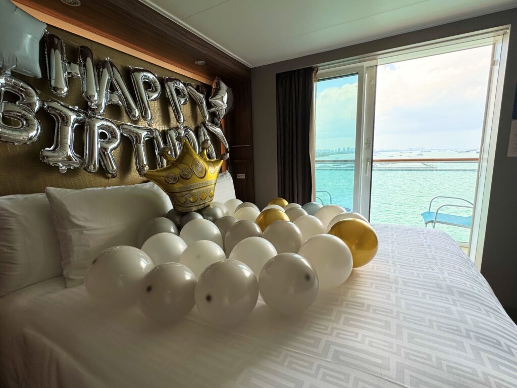 実は……今回は、誕生日&結婚記念日をクルーズで迎え……思いがけぬサプライズを受けました。(装飾やケーキ、スパークリングワイン事前予約/有料)客室に入った瞬間、ふわっと甘い香りが……テレビモニターには「HAPPY BIRTHDAY」音楽も流れていました!