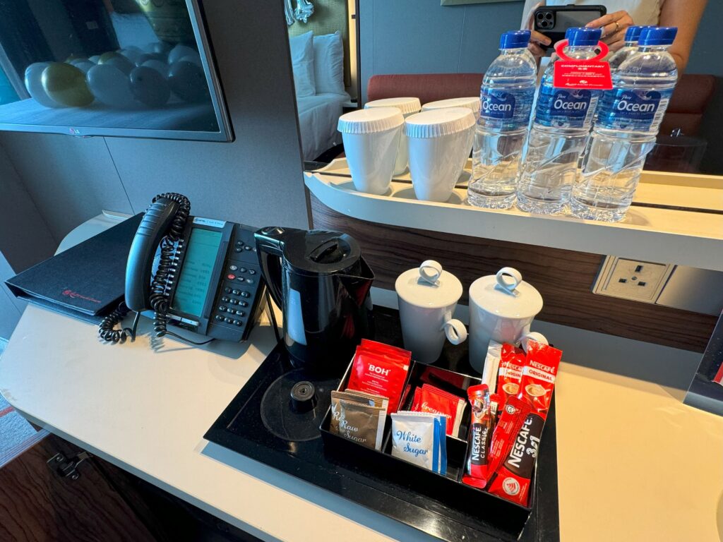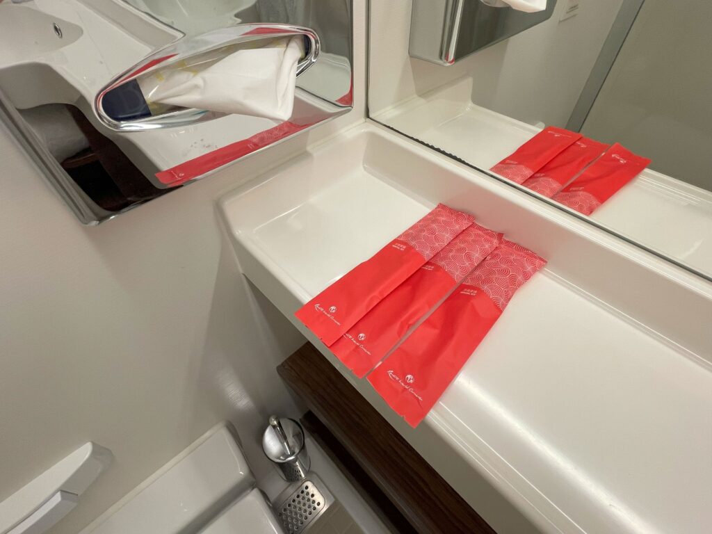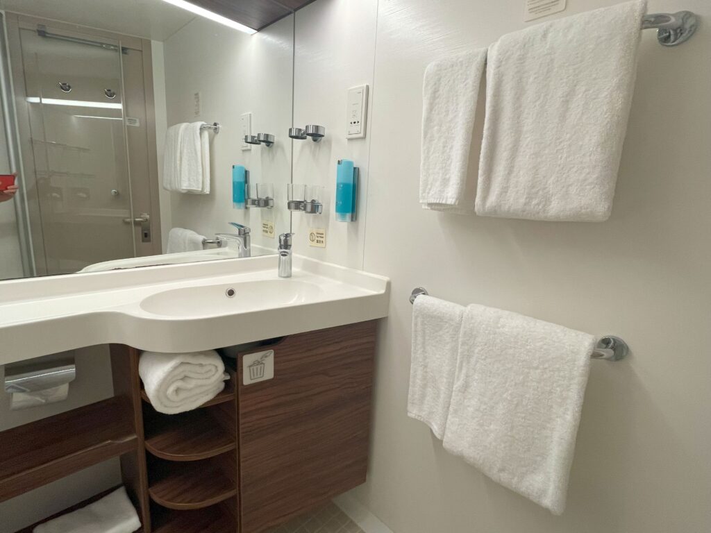 特筆すべきは、五つ星ホテルにあるような、ふかふかのタオル!!毎回クルーズ船にタオルを持参する私も今回出番なし。歯ブラシやティッシュボックスもありました。客室内のボトルウォーター無料も嬉しかったです。(追加は有料)