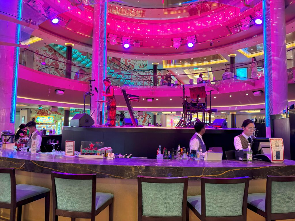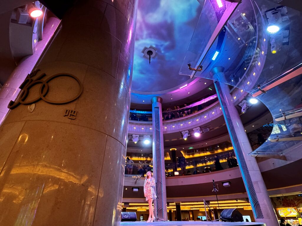 バー360(デッキ6中央)はその名の通り、中央に設けられたステージを360度どの席からでも楽しめるユニークな造りになっています。ドリンクを片手に、毎晩繰り広げられるライブパフォーマンスに酔いしれる、贅沢なひととき。3フロア吹き抜けのため、パフォーマンスが始まると誰しも足を止めます、圧巻です。