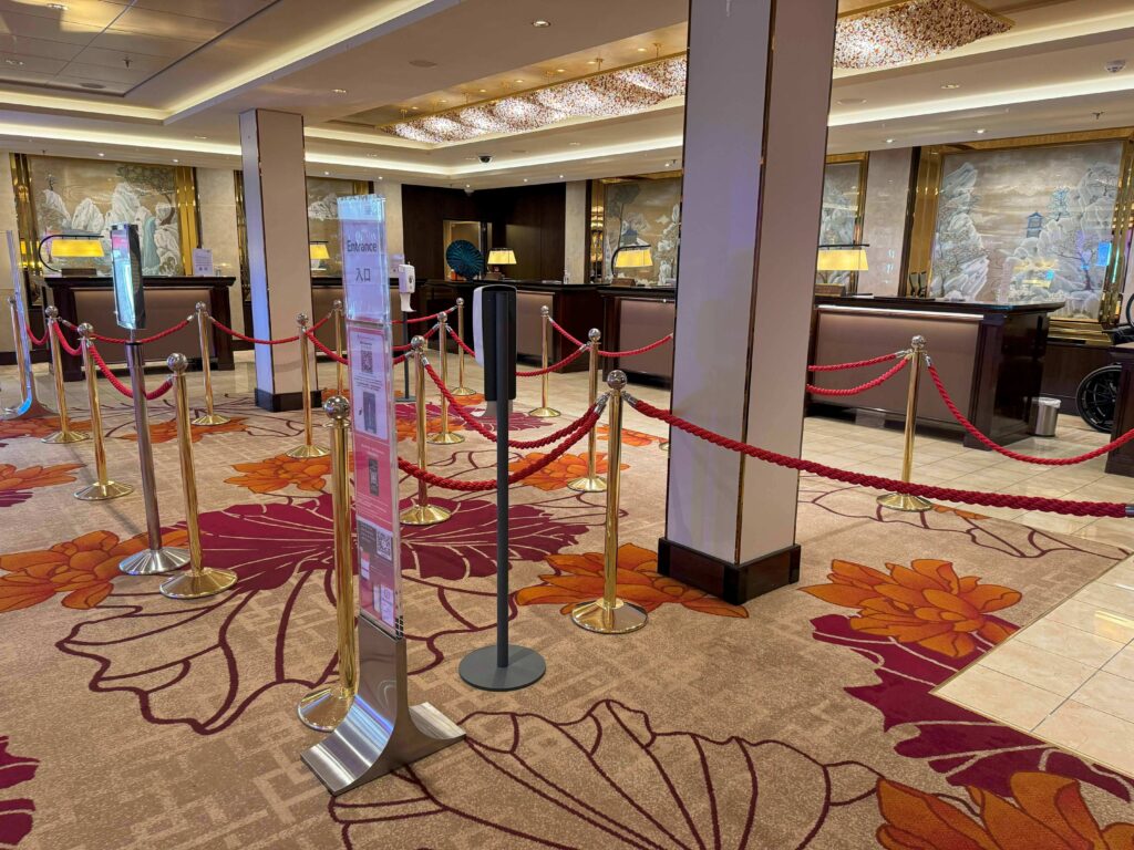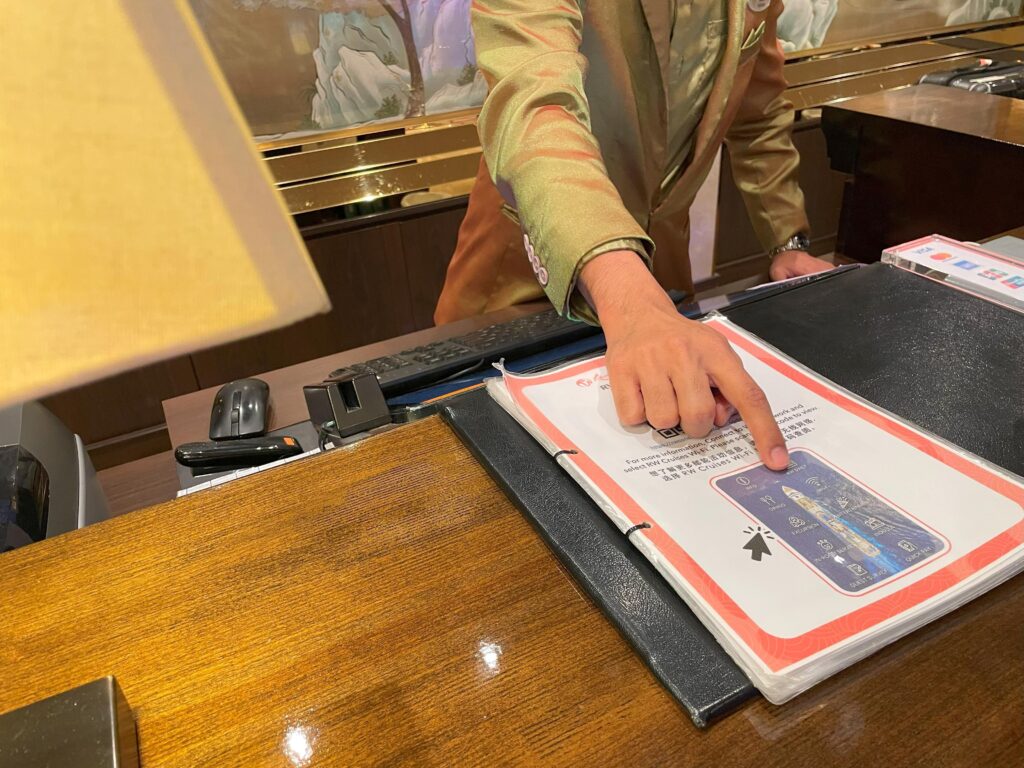 お困りのことがあれば24時間対応のレセプション(デッキ6中央)へ。私は、船内新聞(紙廃止)やアプリのことを聞きました。
