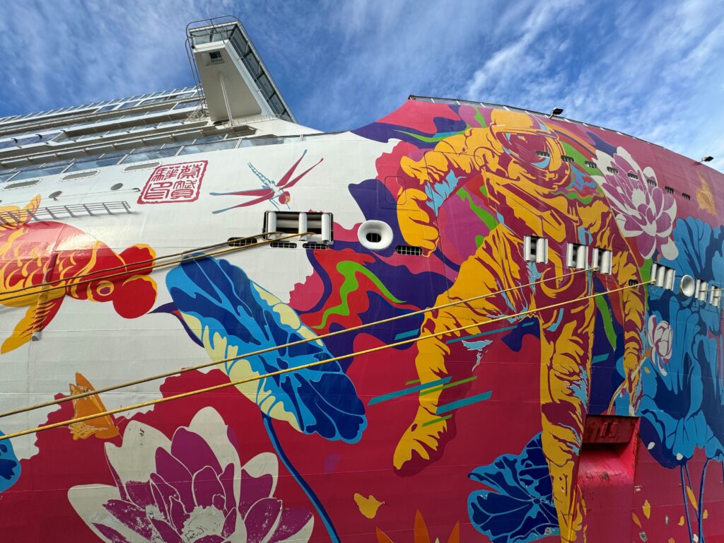 全長335m、15.1万トン、大きい!そのスケールを目の前にすると本当に圧巻です。船体の色鮮やかなアートワークは、細部までじっくりと見入ってしまいます。