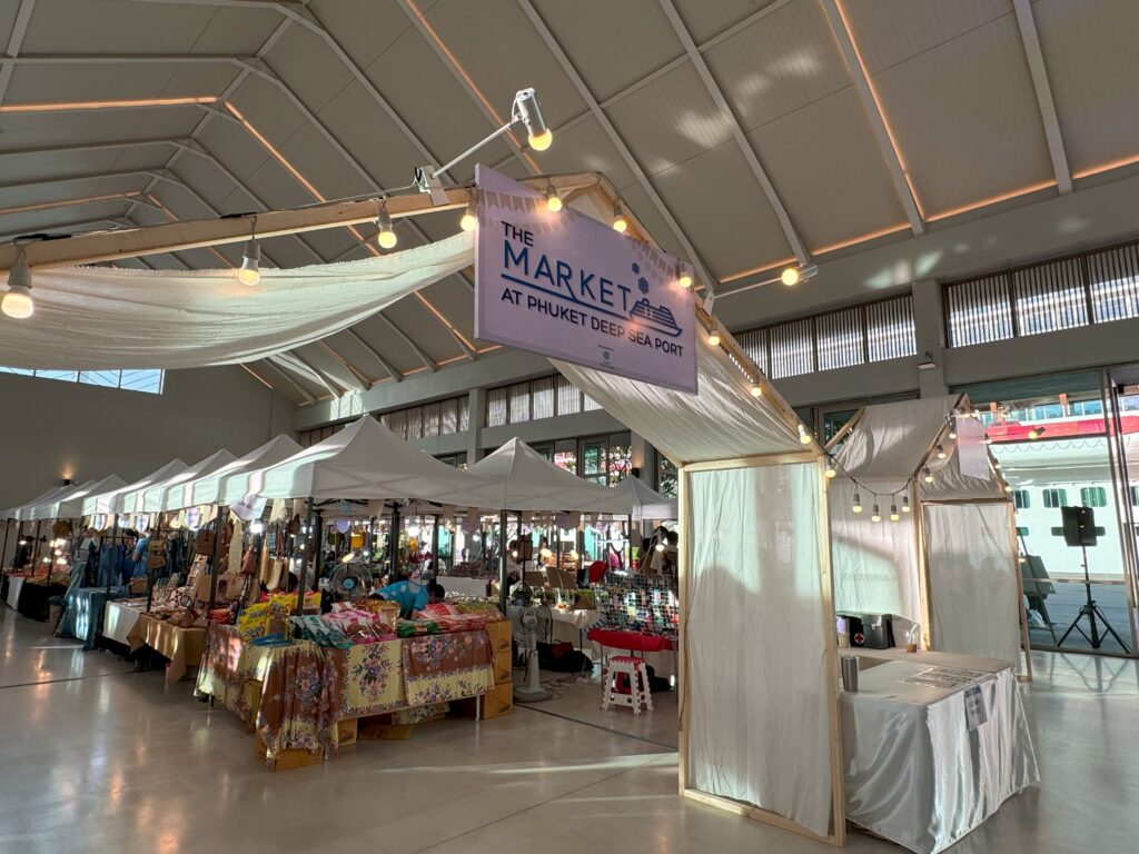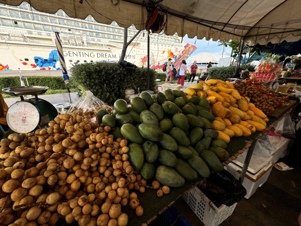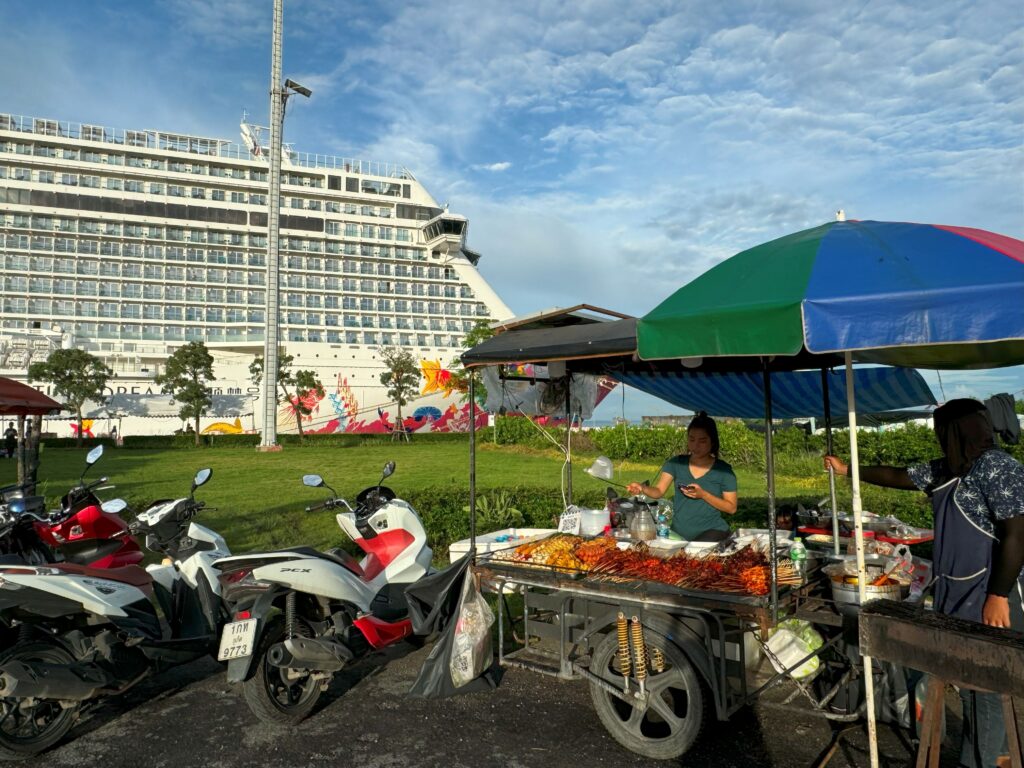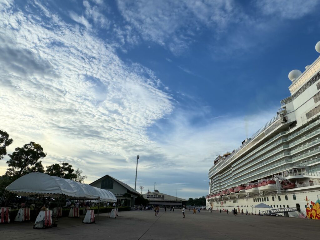 気分転換に、その土地の空気を肌で感じたいため観光はせずとも下船はします。ここプーケットでは、目と鼻の先にマルシェが!気になりつつも、まずはこの巨大な船体全体をバックに記念撮影。