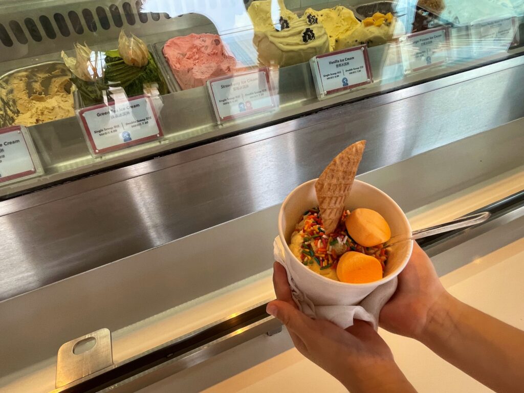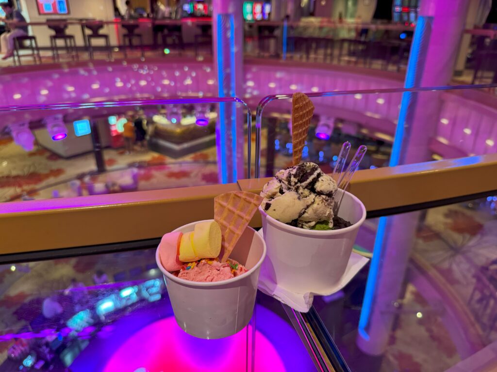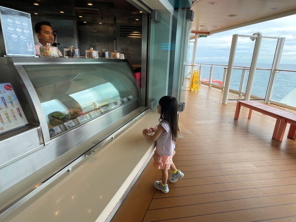 ここには、美味しそうなフレーバーのジェラートとフローズンヨーグルトがずらり。テイクアウトできるのが嬉しいポイントで、海を眺めながら味わうことができます。トッピングもでき、クルーズ中は毎日通ってしまうほどでした。