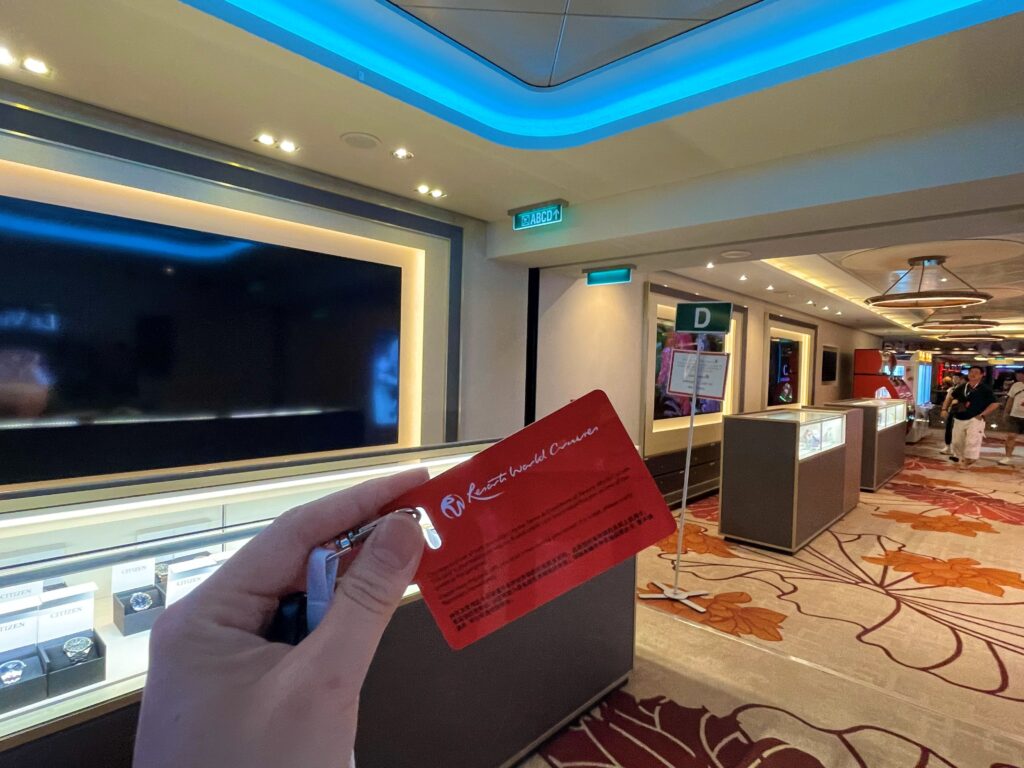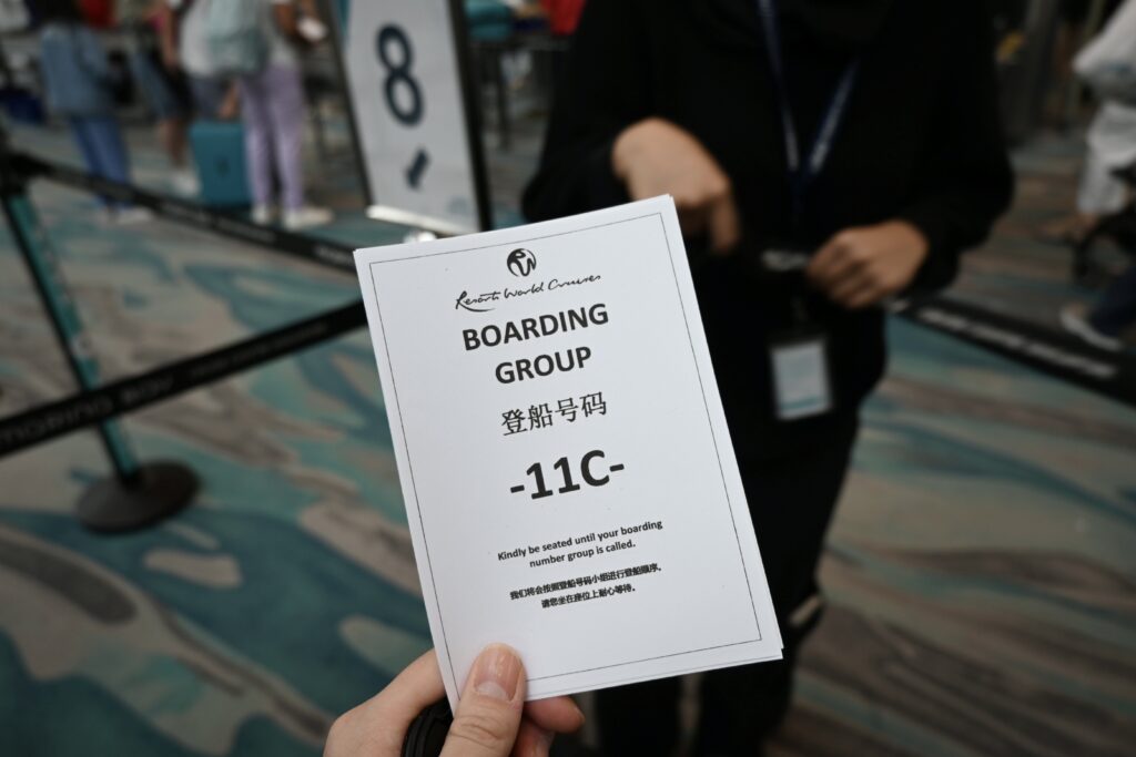 チェックイン時はパスポートと乗船券を提示し、この場でクルーズカードをいただきました。穴が開いていて首からかけられるタイプで便利。写真も撮られることがないので、代表者の方のみ並んでの手続きで良いようです。