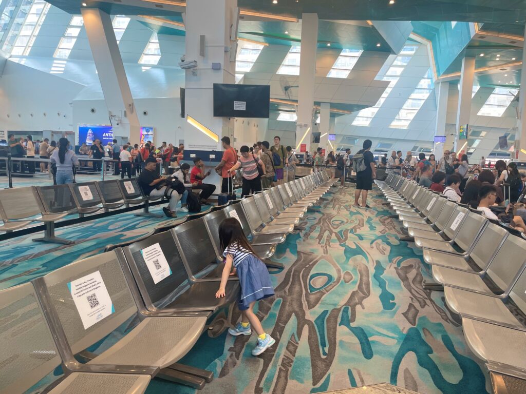 続いてセキュリティチェック。食べ物は持ち込みNGですが、この時はドリンクは大丈夫でした。ロビーは広々としていて、フリーWiFiサクサク、座る場所もたくさんあり、グループ分けされた番号が呼ばれるまで待機です。