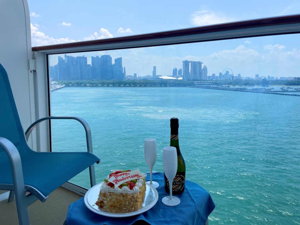 この時食べたアニバーサリーケーキが美味しくて(クリームも甘さ控えめ!)あの感動は今も忘れられません。そうこうしているうちに、出港。バルコニーからゆっくりと、確かに移りゆく景色に見入りながら贅沢な眺めを心ゆくまで堪能しました。