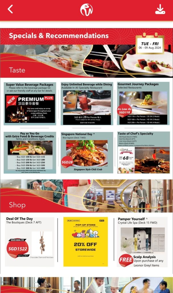 アプリからレストランの営業時間、イベント(エンターテイメント)のスケジュールをはじめ、寄港地ガイドなど確認できます。情報が満載なので、活用すればするほどクルーズライフを楽しめますね。