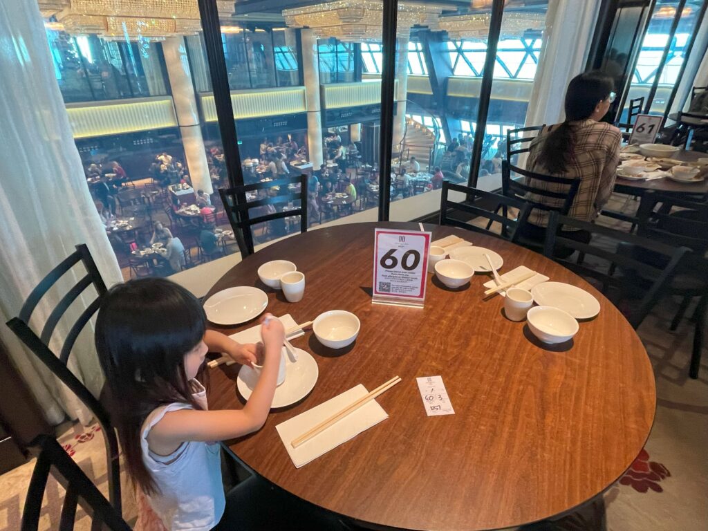 メインダイニングは上下の階層に分かれ、その日の気分で中華と洋食が選べます。フリーシーティング制で好きな時間に行けます。この日はドリームダイニングルーム(デッキ 7 後方)を利用しました。