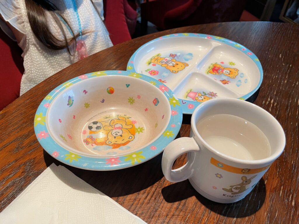 受付で番号が書いた紙をいただき、テーブルには席札が置いてあります。ベビーカーで行くと、この時は個室のようなところを案内されました。子供用の可愛らしいカトラリーを用意してくださったおかげで、娘も興味津々。取り分けながらいつもよりたくさん食べてくれました。