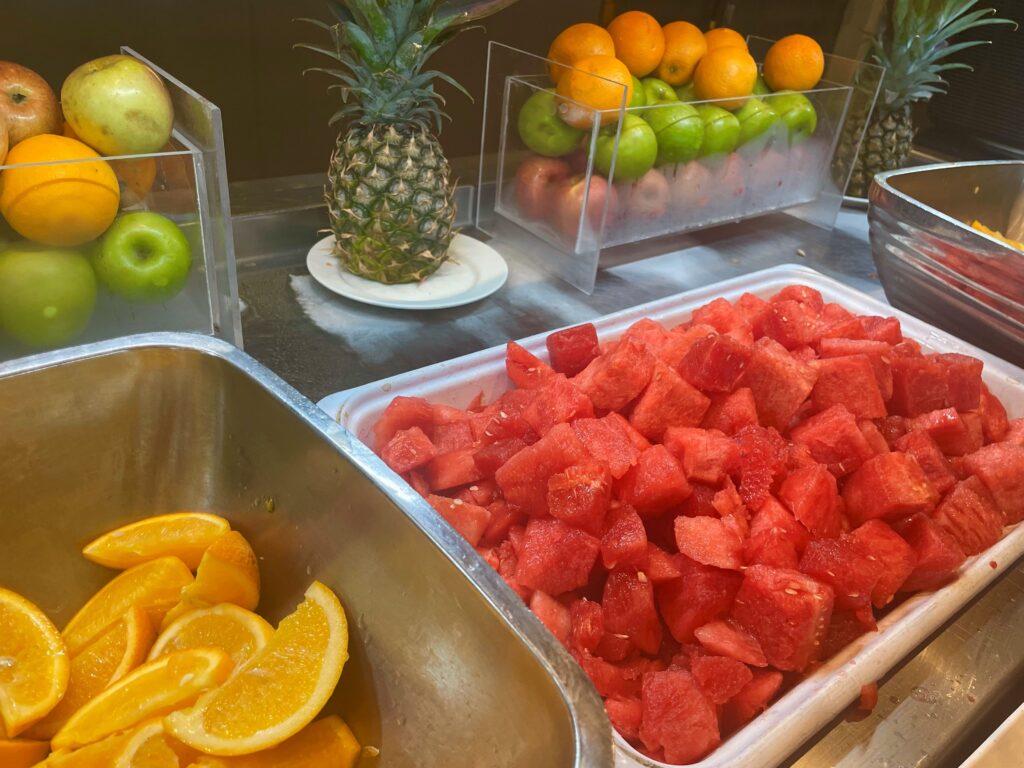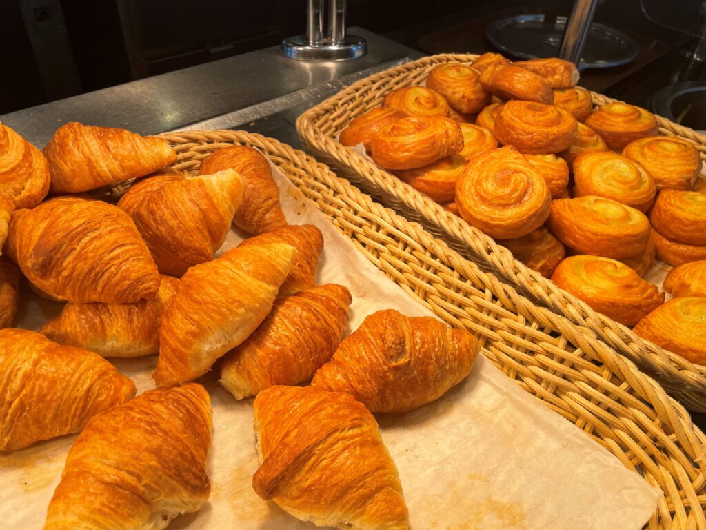 朝食は珈琲だけでなく、ジュースも無料です。ビュッフェの内容も充実しており、フレッシュなサラダはもちろん、甘~いスイカをはじめとするフルーツの種類も豊富。美味しそうなパンもあり、大人も子供も満足できるラインナップでした。
