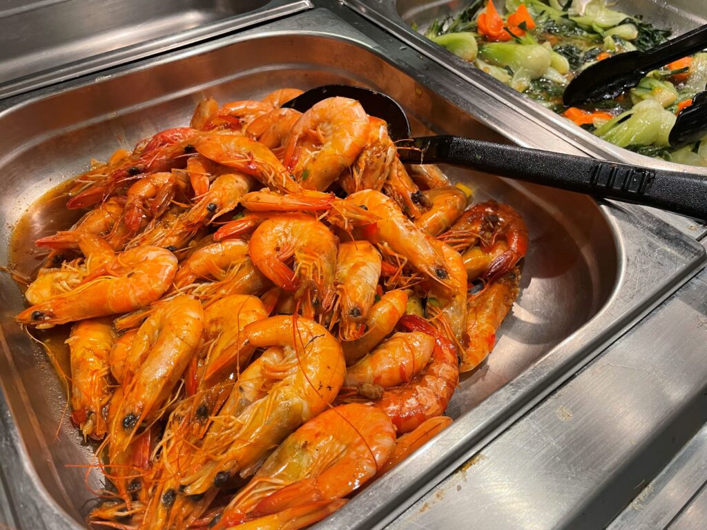 ランチで海老を堪能したばかりだというのに…ビュッフェでも美味しそうな海老の誘惑には抗えず、また違った味付けでついつい手が伸びてしまいます。後にも先にも、こんな贅沢な海老三昧は初めての経験です。新鮮で味が濃く、いくらでも食べられてしまうほど。本当に振り返っても幸せな時間でした。