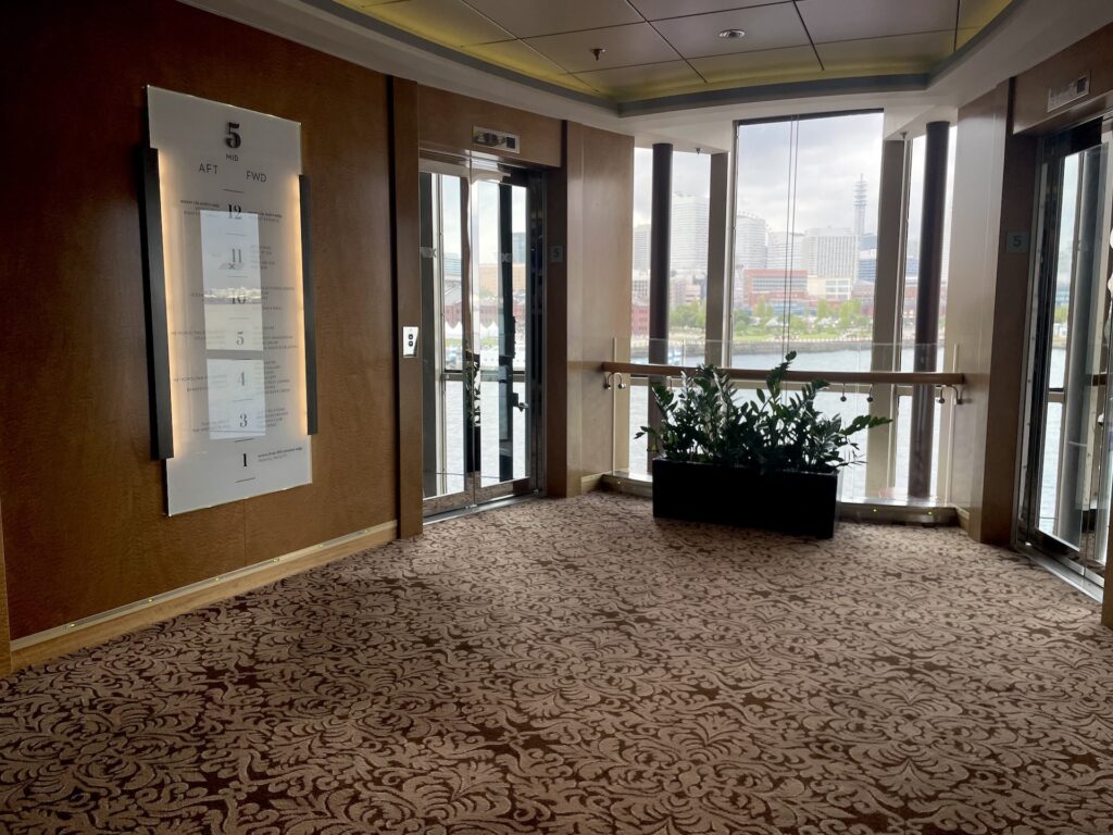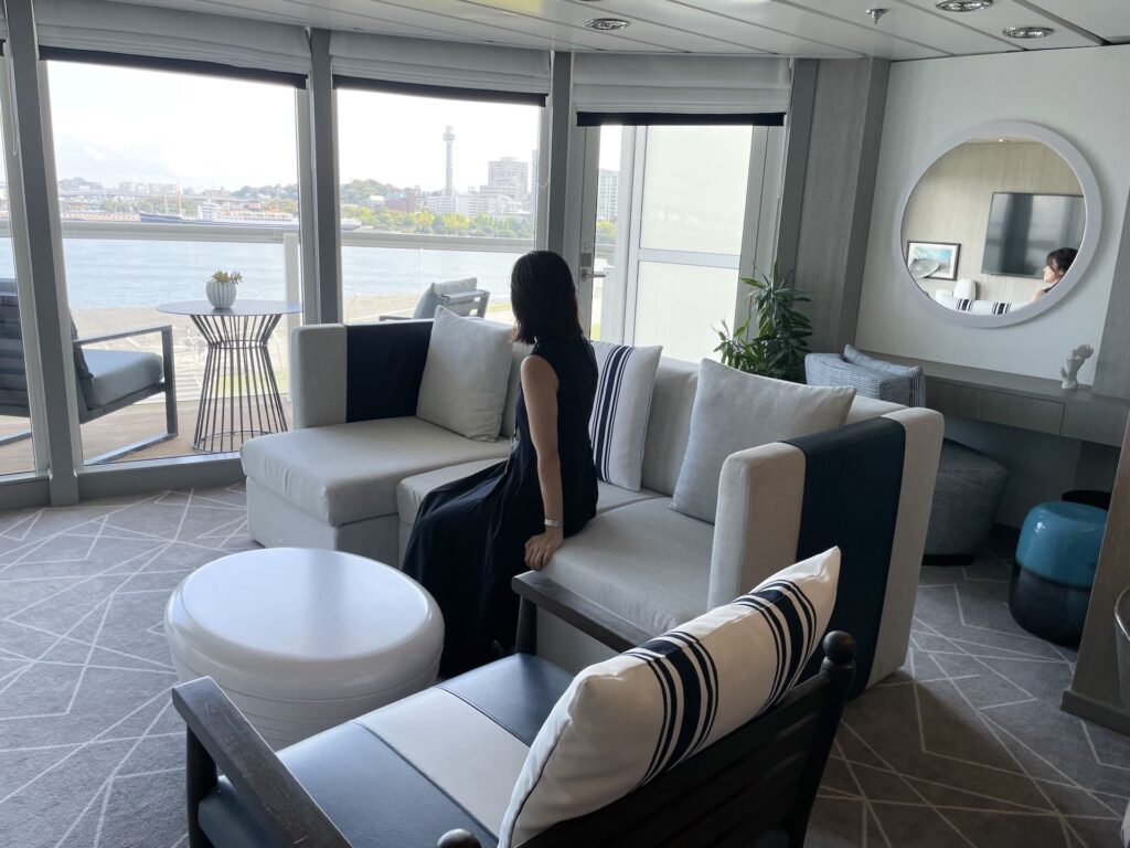 3層吹き抜けの長い階段「グランド・フォイヤー」も特徴的で、船内全体が想像以上にスタイリッシュで洗練されたデザインに心躍り、優雅な船内空間が想像できました。