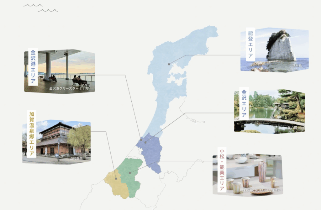 クルーズ旅を「非日常への入口」としてだけでなく、地域観光のハブとして位置づけ。金沢港クルーズターミナルや周辺観光地をモデルコースとしてまとめ、クルーズ出航前後の滞在プランを提案。金沢港からはじまる観光の新しいかたちを発信しています。