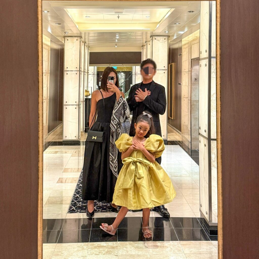 夫はスーツですが、インナーはシャツではなくハイネックのカットソー、私はワンショルダーのドレス、娘はこの日のショーがディズニーソングということもあり美女と野獣のベル風のドレスを着用しました。