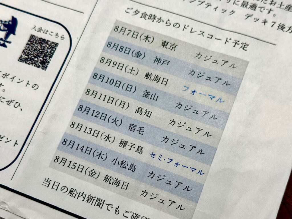乗船初日の船内新聞に全日程のドレスコードが記載されていました。