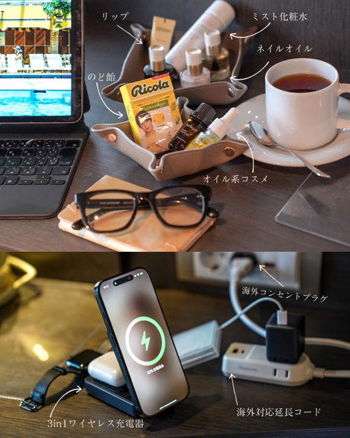 キャビン内の限られた充電ステーションを上手に活用するためには、海外対応延長コードや3in1タイプのワイヤレス充電器、そして海外コンセントプラグを準備しましょう。