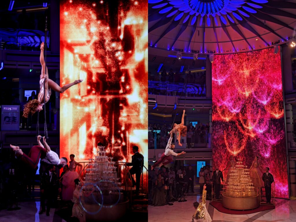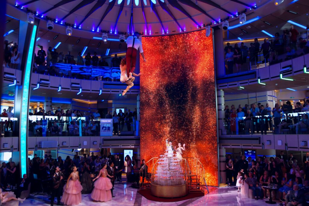 プリンセス・クルーズでお馴染み、船長主催による乗船歓迎パーティーも変わらず「ピアッツァ」で行われますが、従来の演出とは全く異なる、驚きの展開に圧倒されます。