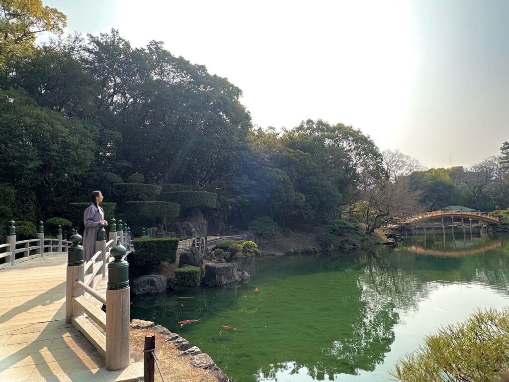こんな素敵な日本庭園を和装で歩いたら、歴史の中に自分も溶け込んでいるような気分になれますね。